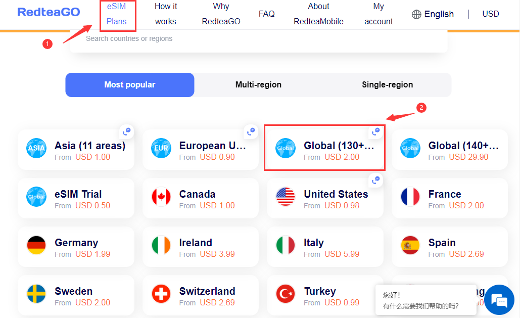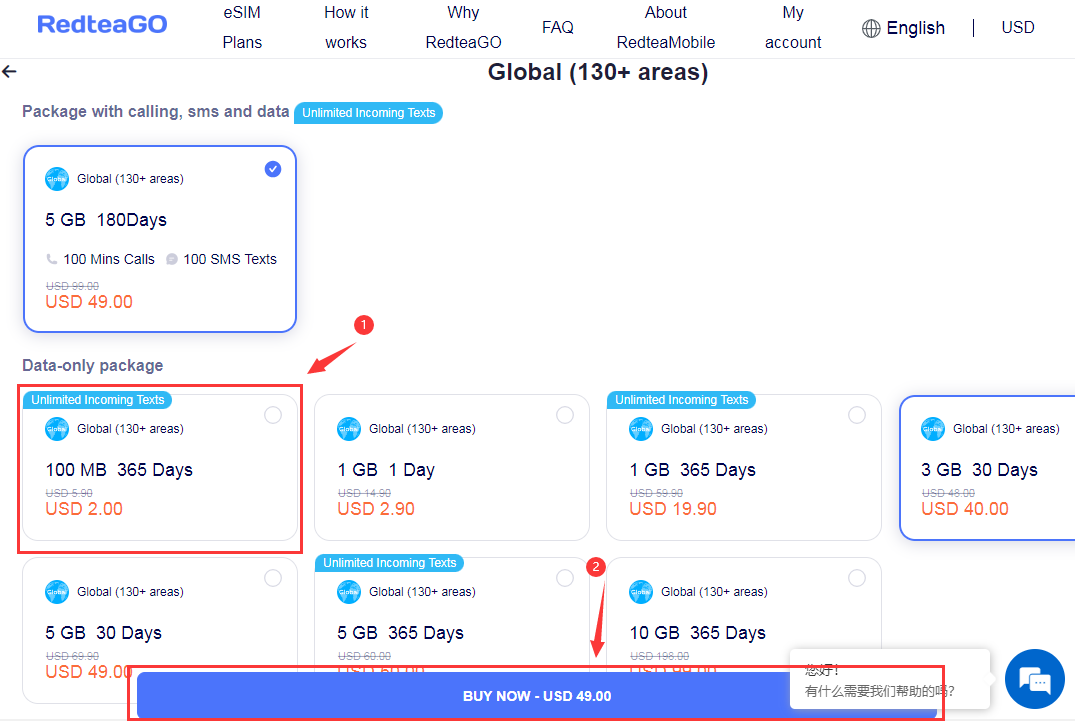 本文以网页方式为例,介绍如何结合代金券,实现以0.49USD的价格购买2美元的Global(130+ areas) Data-only package,薅一个可以用来免费接收短信的+43奥地利手机号。你也可以在RedteaGo APP中进行相同的操作。