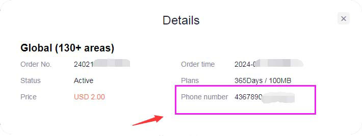点击网页顶部的“My account”-“Orders”,就可以看到刚才购买的流量包。点击卡片右上角的“Details”,就可以在“Phone Number”中看到一个43开头的15位数字。这就是我们要召唤的奥地利手机号,其中43表示奥地利的国际区号。