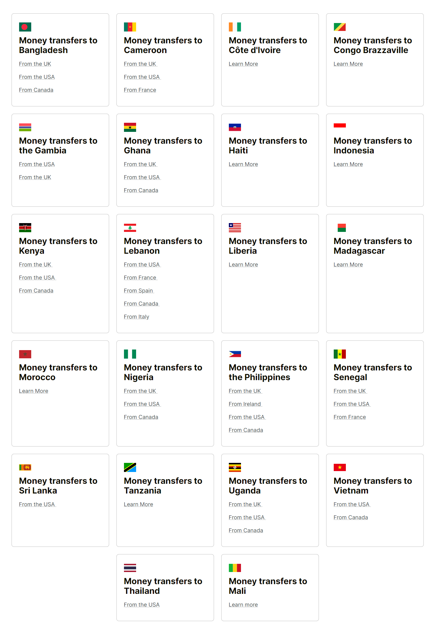 Sendwave支持从英国、欧洲、美国、加拿大向泰国、尼日利亚、墨西哥等约29个国家进行汇款,支持电子钱包、银行账户、现金等收款方式,一些收款国家和收款方式低至0费率。(参考信息:Sendwave官网 - 支持的国家和货币)