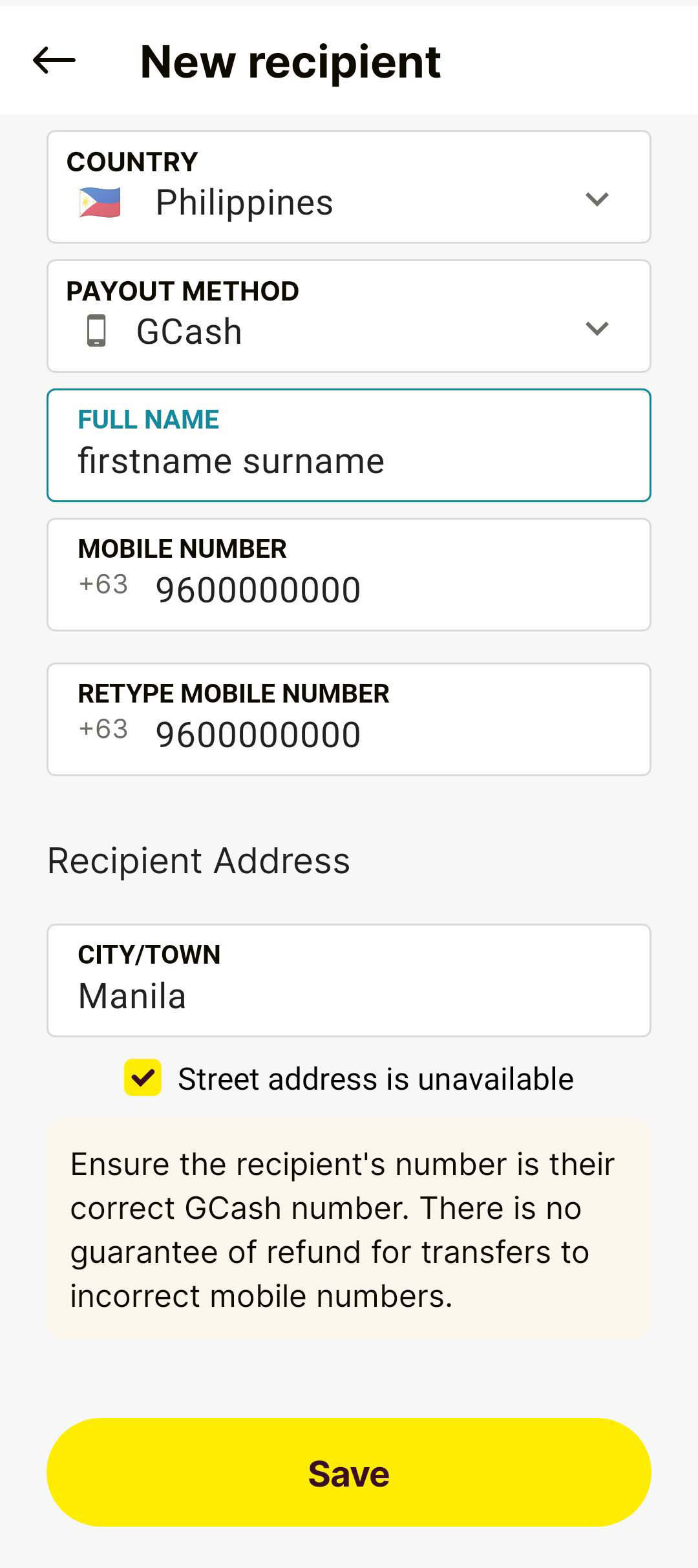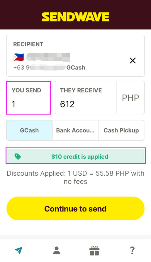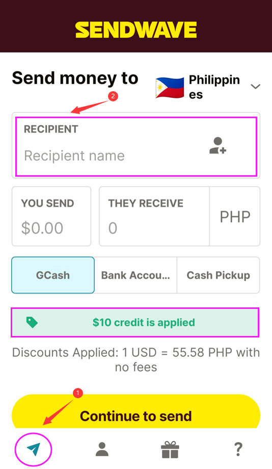 这里我们以向菲律宾的GCash电子钱包汇款为例。如果你有Sendwave支持的任何国家的收款方式,均可自行填写。