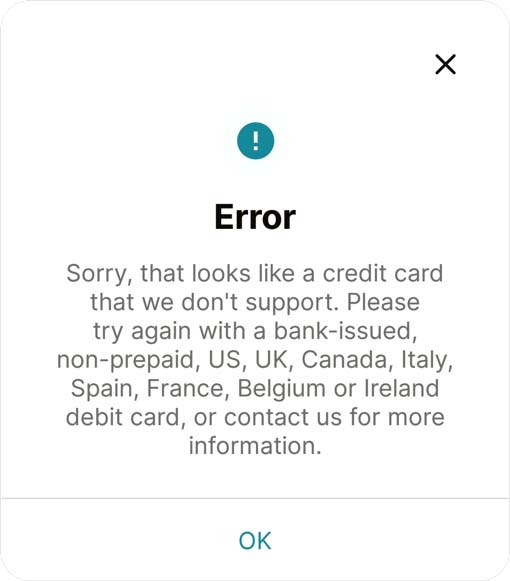 根据APP的提示,付款支持使用美国、英国、加拿大、意大利、西班牙、法国、比利时、爱尔兰发行的借记卡。建议使用与自己注册手机号的国家相同的借记卡。