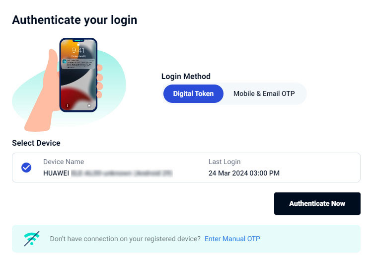 接下来会要求我们选择一种登录认证方式。我们这里使用“Digital Token”,然后在列表中选择APP绑定的设备,点击“Authenticate Now”。