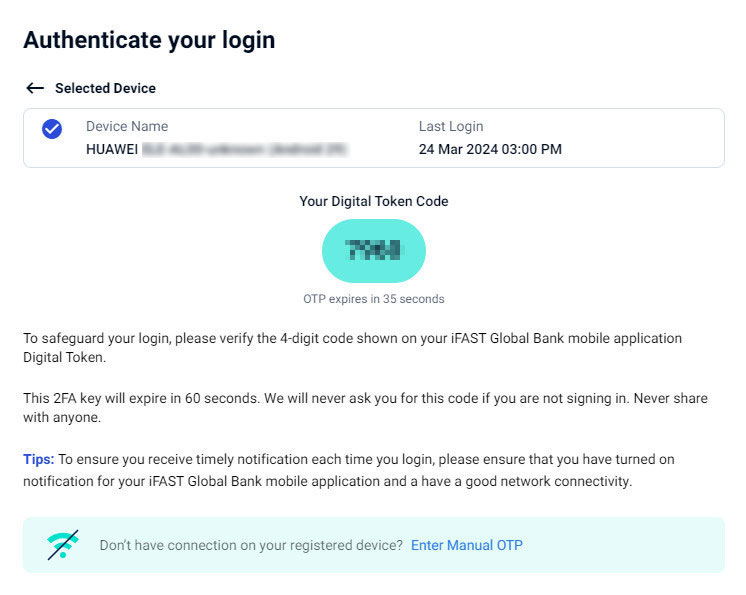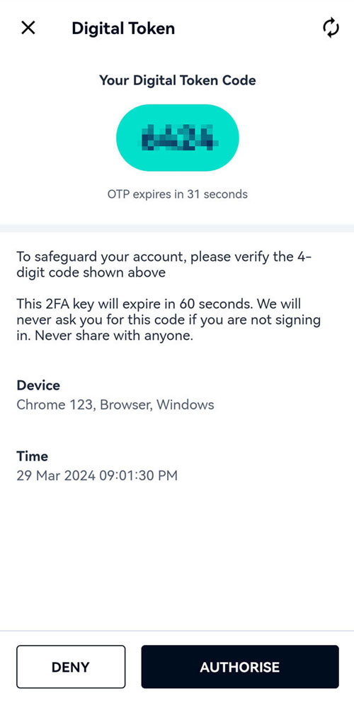 接下来在手机上登录iFAST Global Bank的APP,依次点击左上角的“菜单” - “Digital Token”,确认APP上显示的“Digital Token”与网页中的一致后,点击APP底部的“Authorise”按钮。此时网页端就会成功登录。