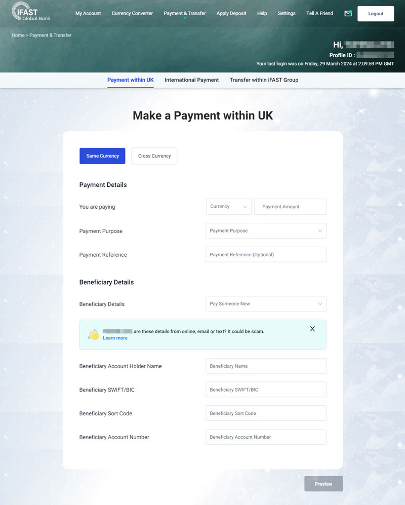 依次点击页面顶部的“Payment & Transfer” - “Payment within UK”,可以向英国国内的银行进行转账。向英国国内的银行汇英镑免费,汇欧元、美元、新元、港币、人民币的价格依次为12EUR、18USD、25SGD、145HKD、126CNY。