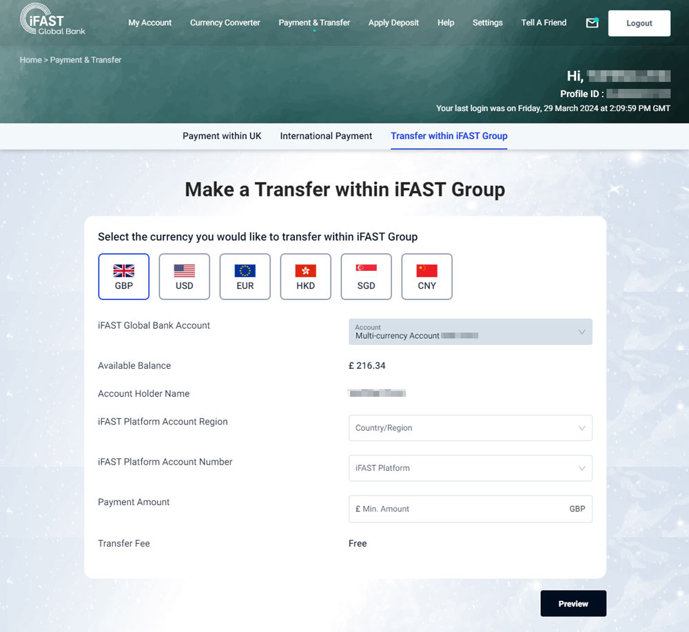 iFAST支持在iFAST Global Bank、FSMOne SG、FSMOne HK、FSMOne MY之间免费转账。