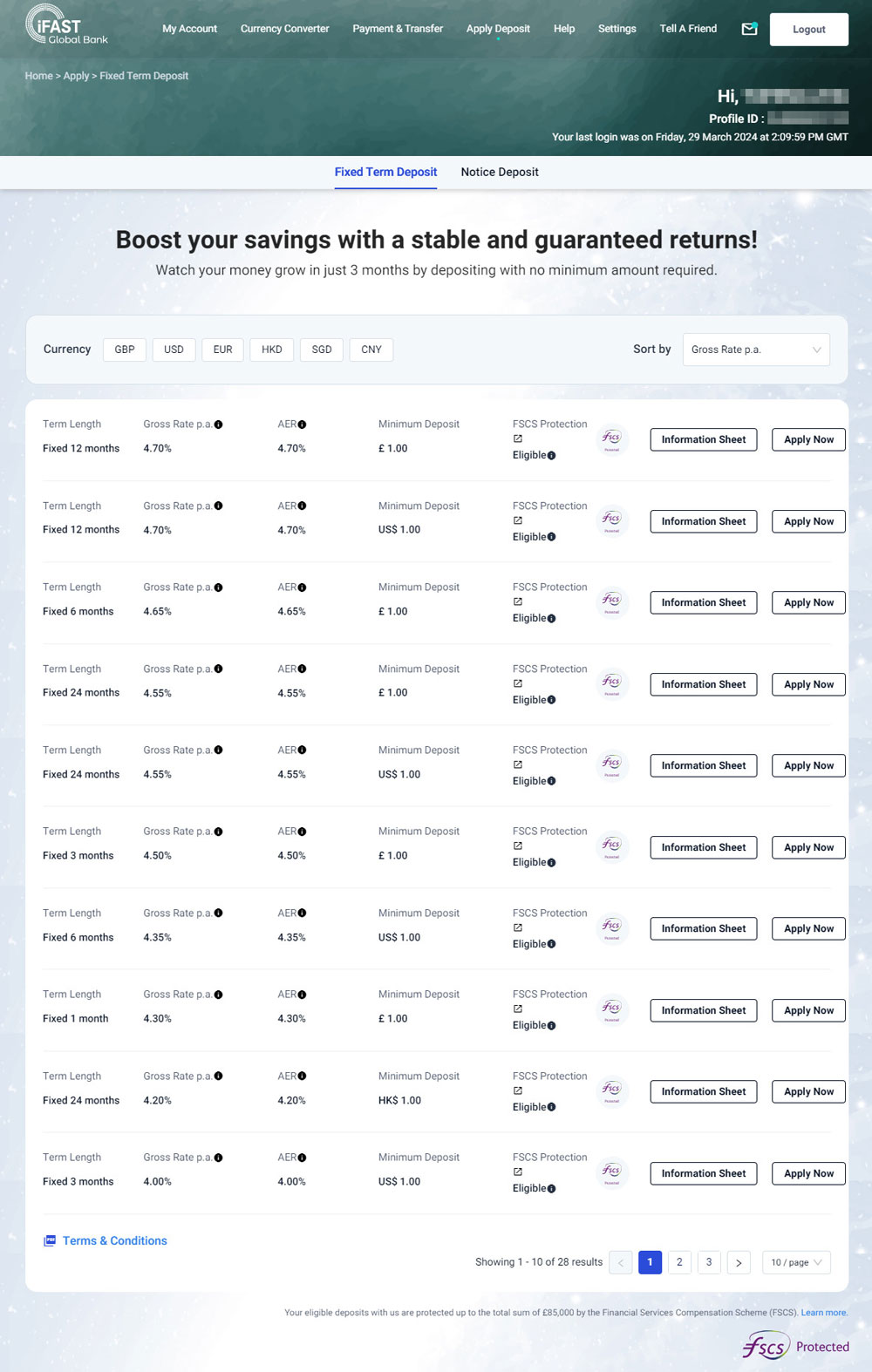点击页面顶部的“Apply Deposit”,可以查看不同币种、不同期限的固定存款、通知存款的利率。点击对应的“Apply Now”即可办理存款。