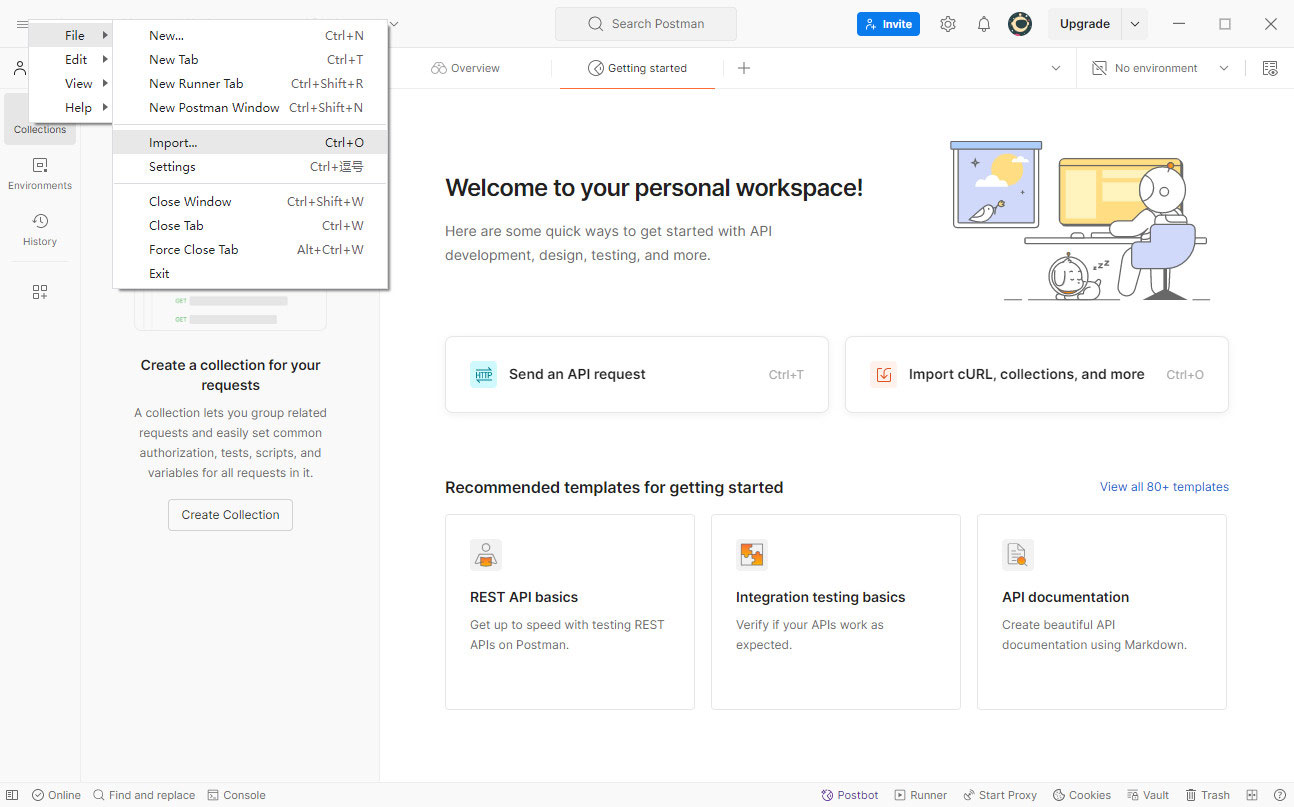 回到PostMan,依次点击客户端左上角的“Menu” - “File” - “Import”,或者直接按下“Ctrl + O”快捷键,打开导入界面。