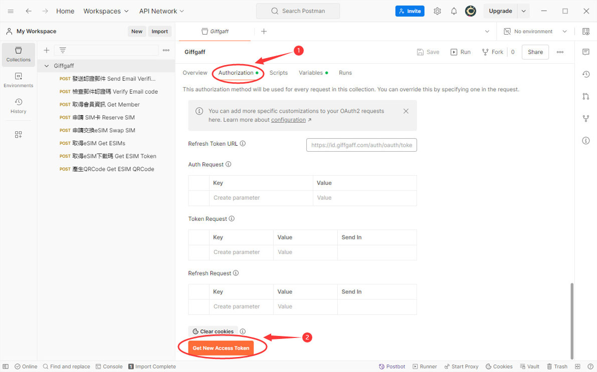 如下图所示,依次点击“Authorization” - “Get New Access Token”。