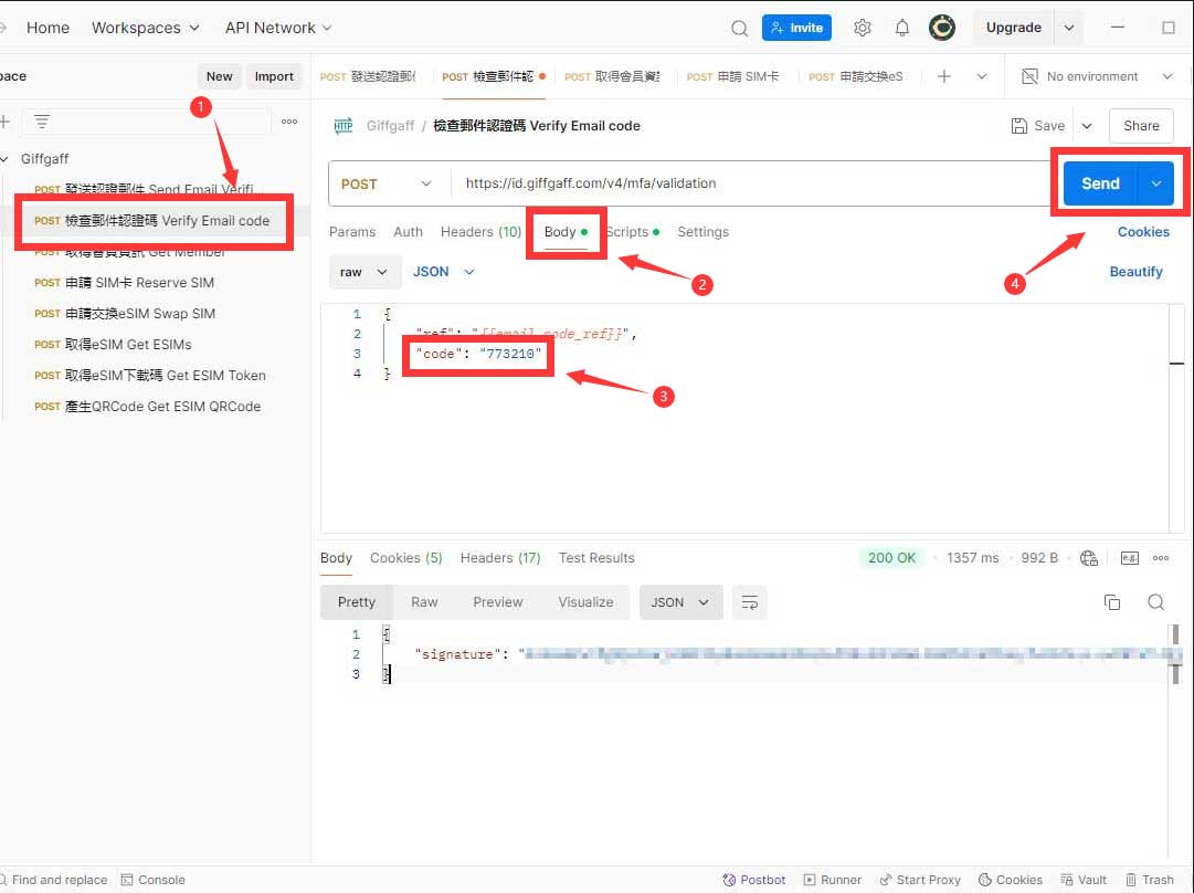 点击左侧列表中的“检查邮件认证码”,然后点击“Body”选项卡,如下图所示将收到的验证码填入"code":后边的双引号内,然后点击“Send”按钮。