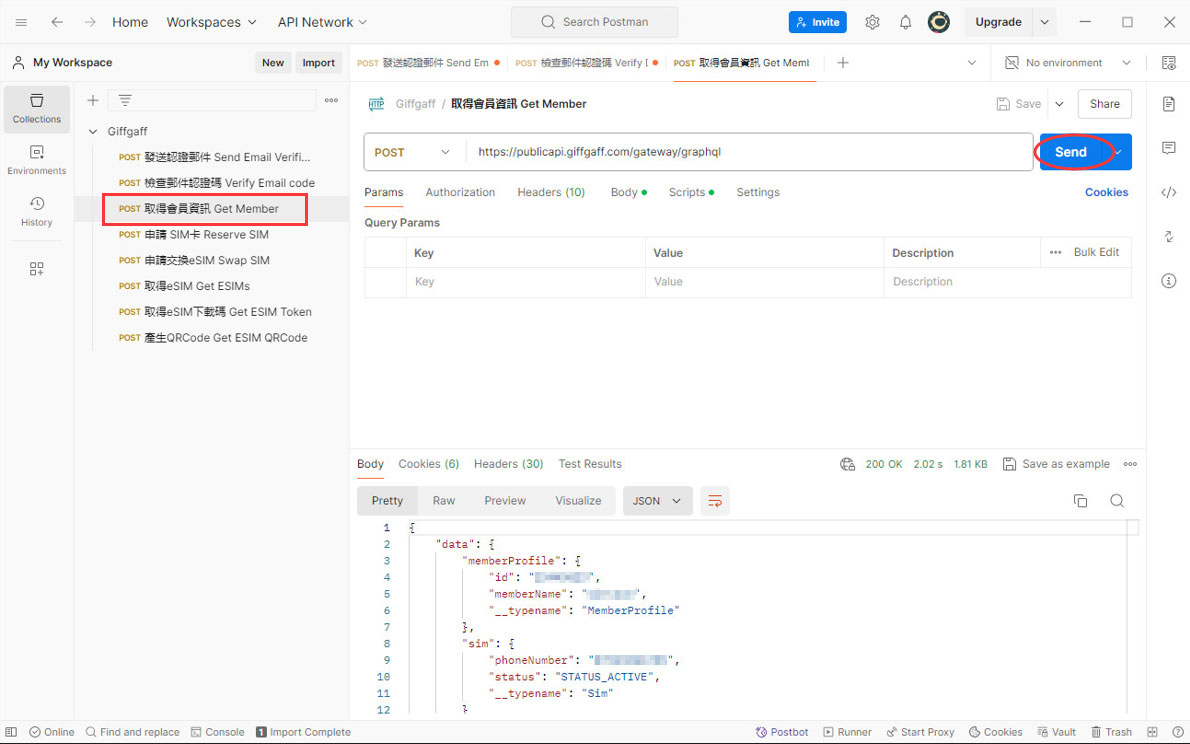 点击左侧列表中的“获取会员资讯”,然后点击右侧的“Send”按钮做一个测试。如果一切正确的话,会返回一个包含各种用户信息的json,如下图所示。