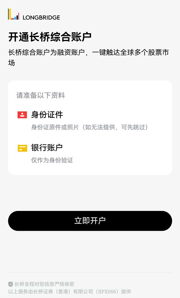 接下来会提示我们准备好身份证和内地银行卡(用于对中国大陆用户进行身份验证,不用于出入金)。点击“立即开户”按钮。