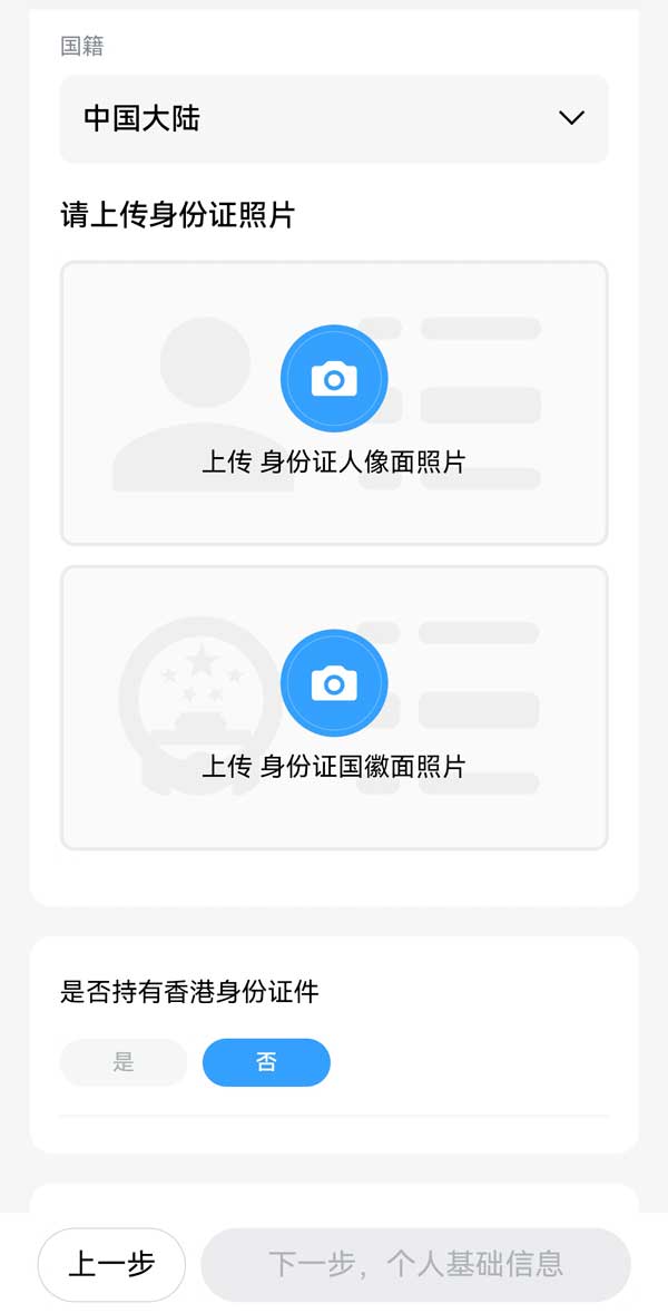 接下来按照页面的提示上传自己的身份证照片正面和反面。如果你需要使用其他证件,请自行选择相应的证件签发国。
