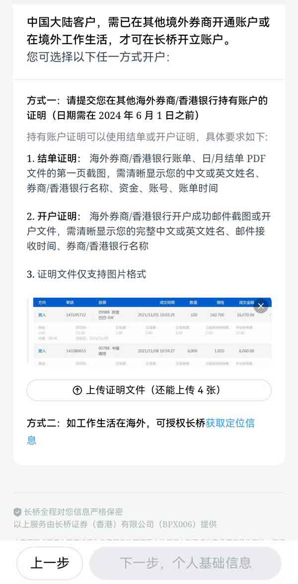 对于第一种方法,需要上传一份2024年06月01日之前的海外券商或者香港银行的日/月结单或者开户证明。
