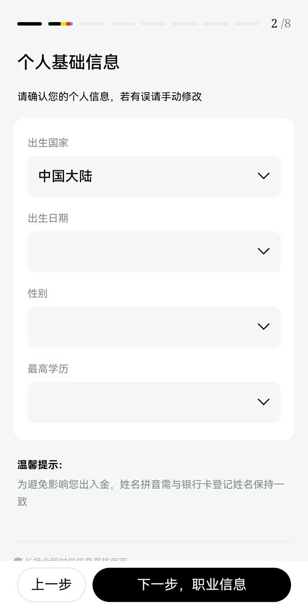 接下来是填写个人基础信息、职业信息、资产信息、投资信息等,按照要求如实填写即可。