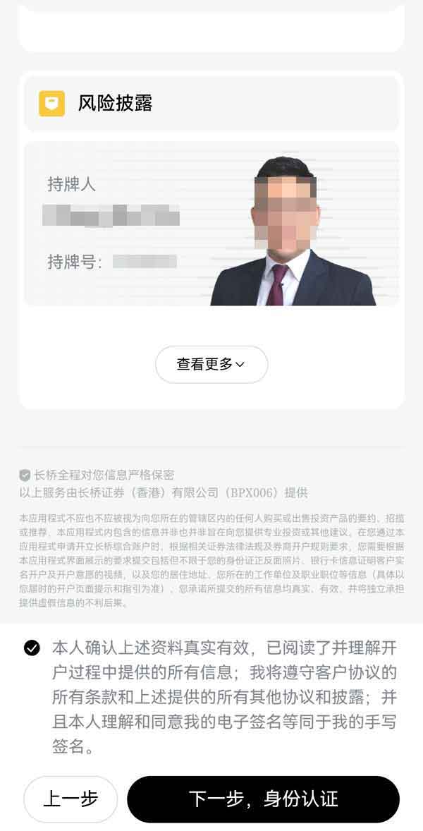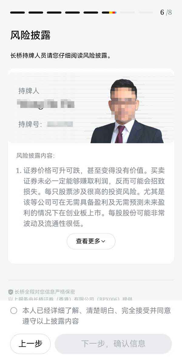 接下来是风险披露。勾选页面底部的“本人已经详细了解…”,点击“下一步,确认信息”。