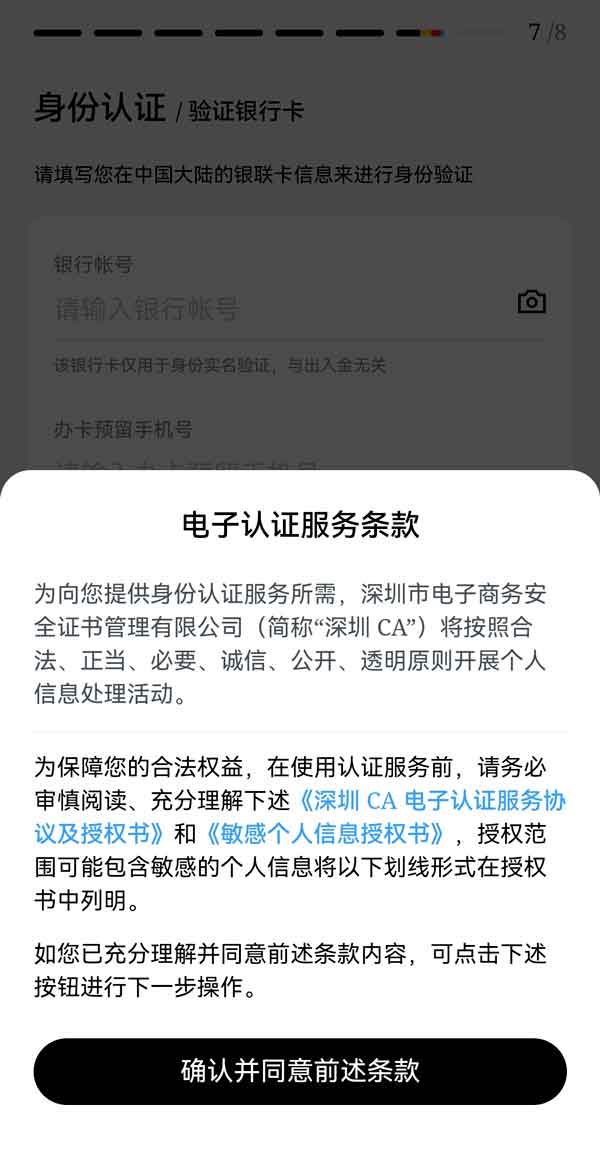 首先会弹出一个“电子认证服务条款”,点击“确认并同意前述条款”。