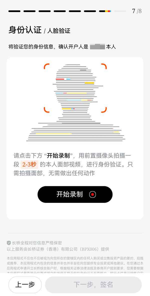 接下来进入“身份认证/人脸验证”页面。点击“开始录制”按钮,将手机摄像头对着自己的面部录一个3秒左右的视频。验证通过后,点击“下一步,签名”按钮。