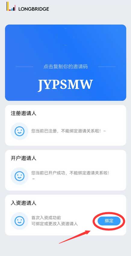 在APP中依次点击“我的” - “邀请好友” - “绑定/更改邀请关系”,检查“入资邀请人”一栏是否已成功绑定阿猪。如未成功绑定,则需点击“绑定”按钮,输入阿猪的邀请码JYPSMW。