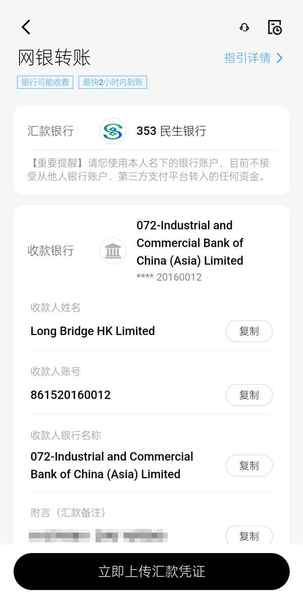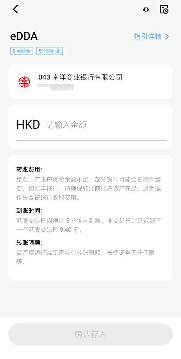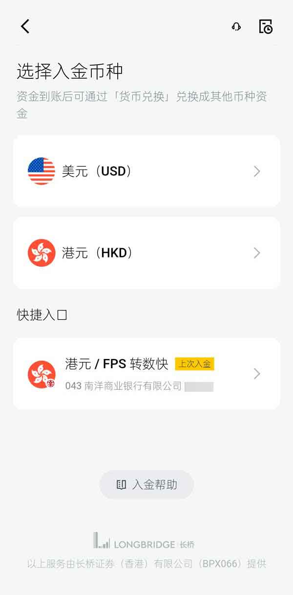 入金的本质是向长桥证券的对公账户进行转账,该账户开立在工银亚洲。香港的券商没有“三方存管”的概念,客户的资金都是存放在券商的对公账户内的。
