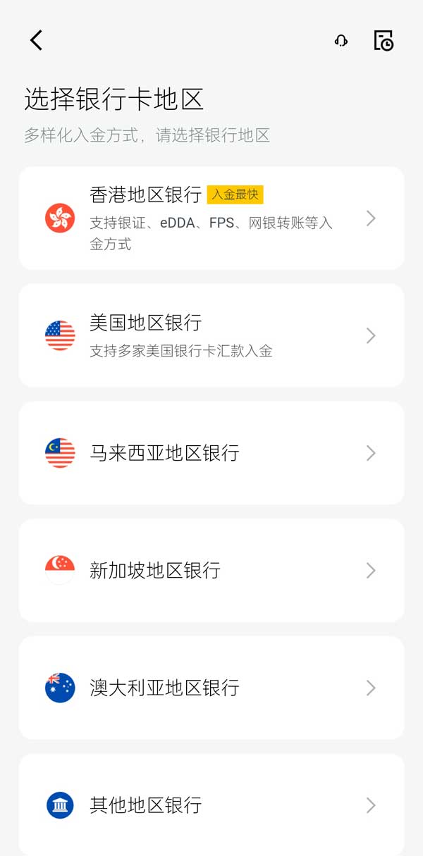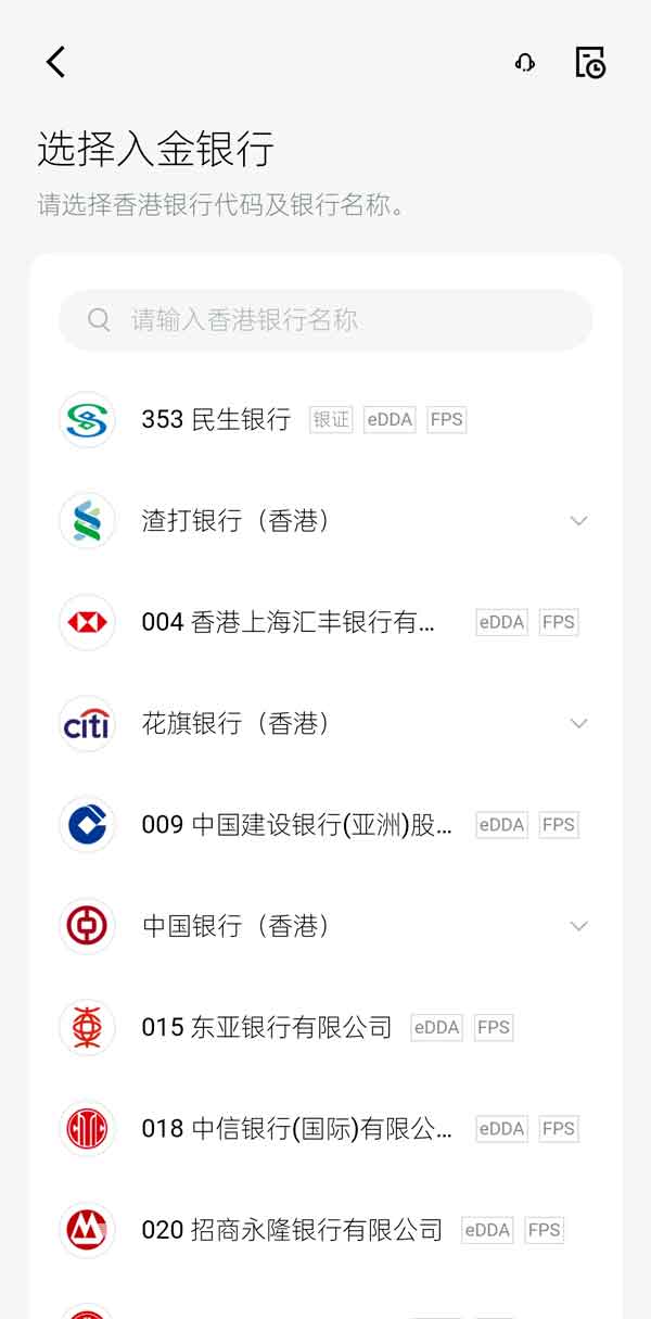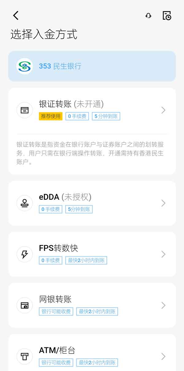 如果你是从香港本地的银行进行入金,则可以选择eDDA快捷入金、FPS(转数快)、网银转账、支票转账、银证转账等方式;如果你是从香港之外的银行进行入金,则只支持电汇的方式。