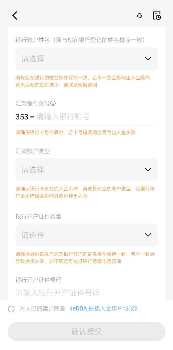 首次使用eDDA(Electronic Direct Debit Authorization,电子直接扣款授权)快捷入金需要先进行一次授权,后续使用无需重复授权。