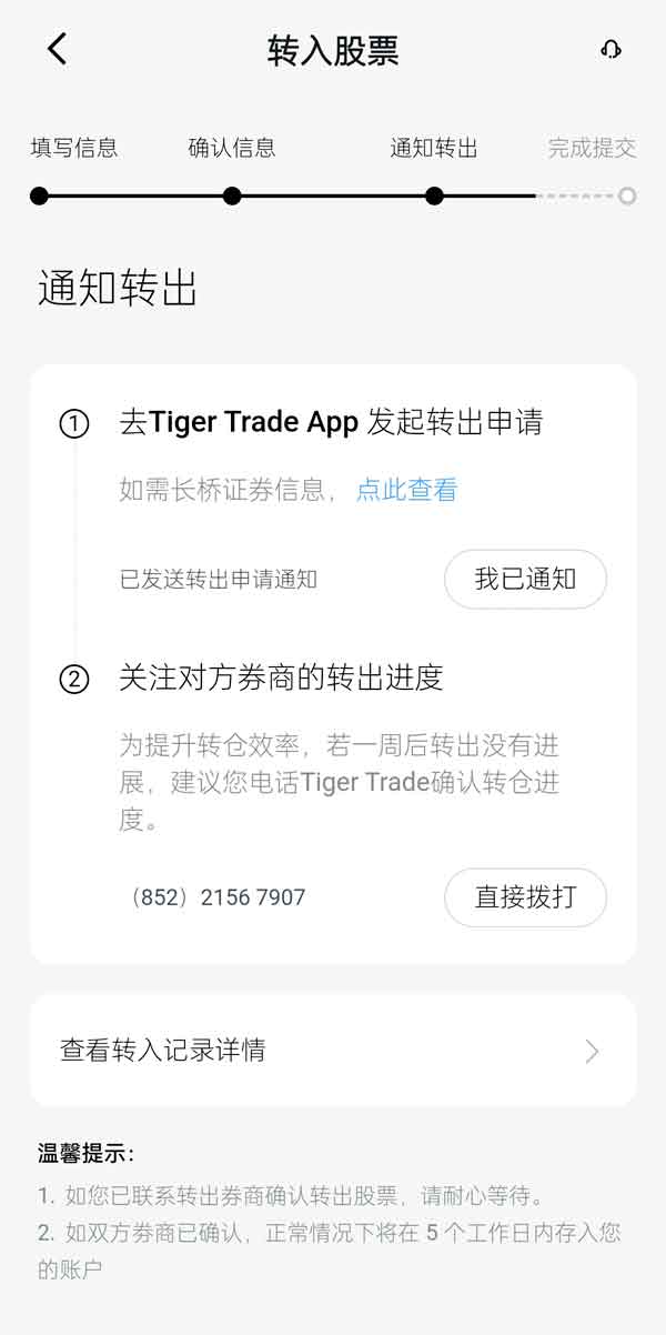完成上述步骤后,回到长桥APP,点击“我已通知”按钮。一切顺利的话,耐心等待3-5个工作日股票即可到账。