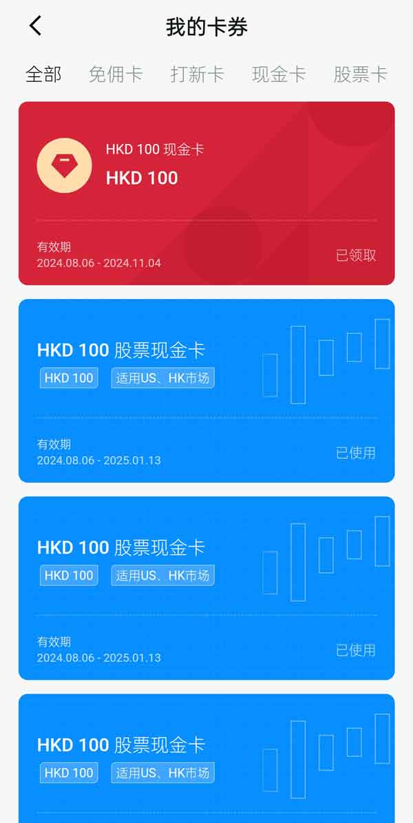 新用户入金、转仓达标后,会收到股票现金卡、港美股终身免佣卡。有时也会额外发放现金卡。