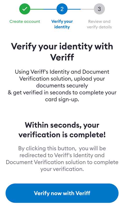 点击“Verify now with Veriff”按钮,进入身份认证流程。身份认证服务由第三方供应商Veriff提供。