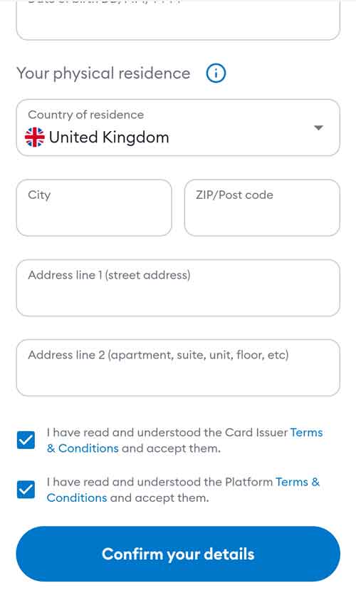 按照页面的提示完善居住地址等个人信息,然后点击“Confirm your details”按钮。