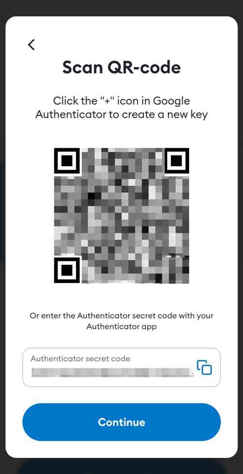 这里Crypto Life也要求我们为新创建的账号开启2FA。页面会显示一个二维码,打开2FA APP扫描这个二维码,即可完成账号绑定。接着点击二维码下方的“Continue”按钮。