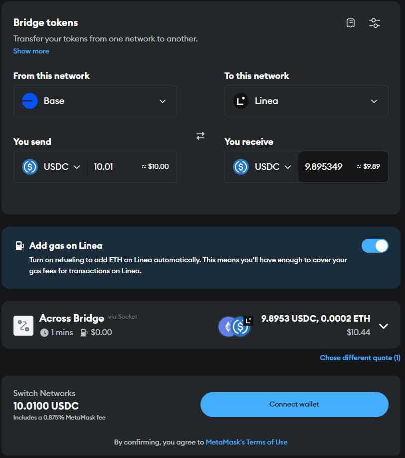 狐狸卡目前仅支持使用Linea链上的USDC、USDT、WETH进行扣款。而Linea链是MetaMask推出的一个网络,相对小众,所以一般还需要我们将自己钱包内其他链上的加密货币桥接转换到Linea链上。
