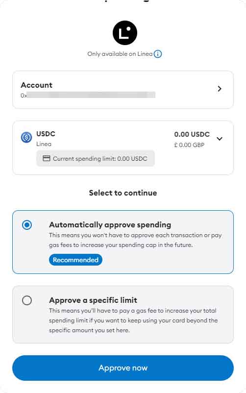 Automatically approve spending表示自动授权,以后无需再次授权;Approve a special limit表示仅授权特定金额,累计消费完这个金额后还需再次授权。