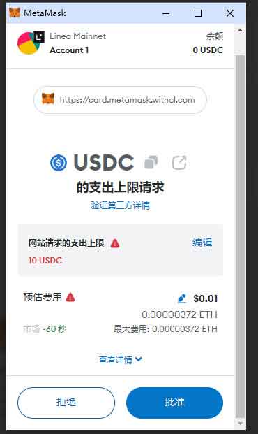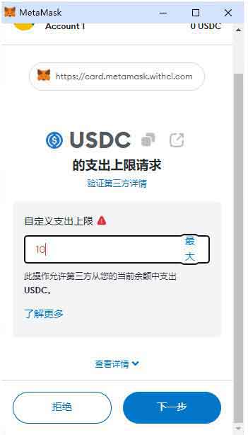 接下来,会跳转到MetaMask钱包。在其中输入本次授权的金额上限,然后点击“下一步”按钮。接着继续点击“批准”按钮。