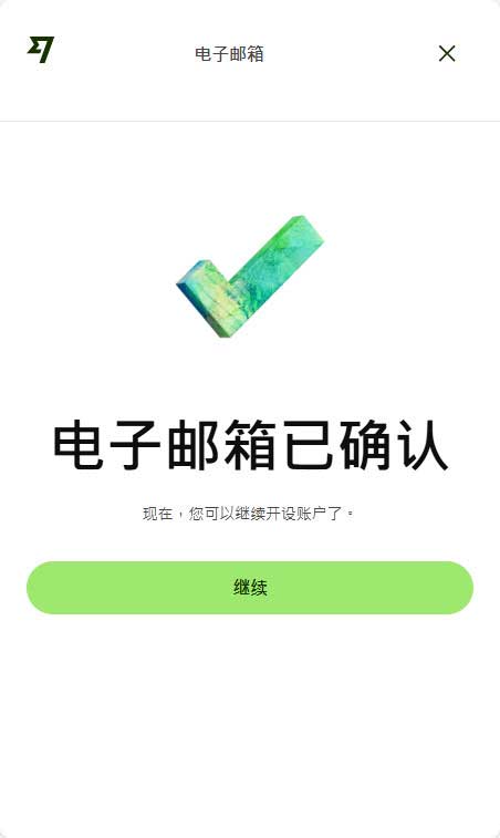 接下来,页面会提示我们“电子邮箱已确认”。点击页面中的“继续”按钮。