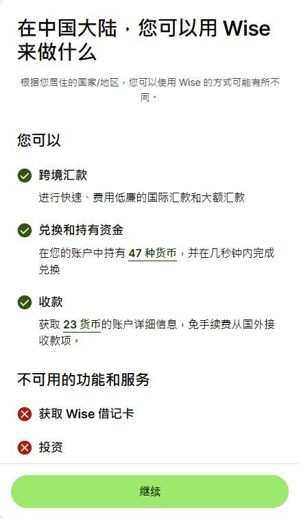 接下来,页面会提示我们借记卡和投资服务在中国不可用。点击“继续”按钮。