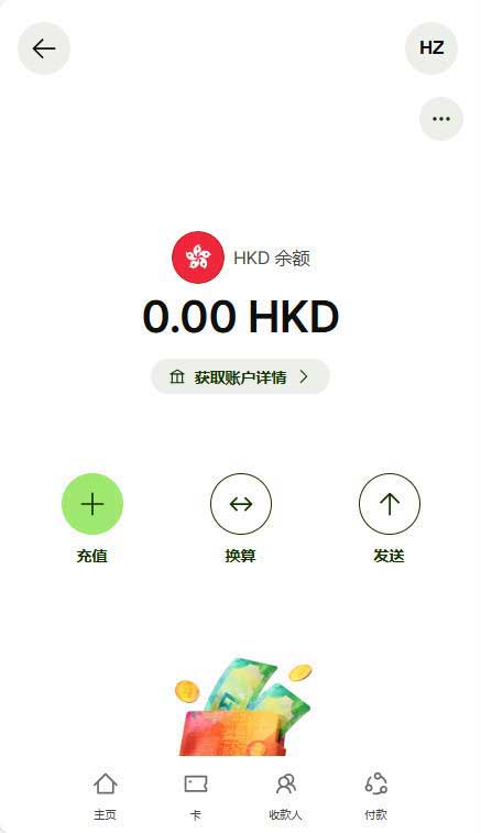点击主页中的“添加货币至您的账户”,接着选择一个币种,点击“确认”按钮。我们这里添加的是港币。