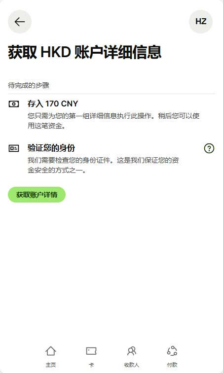 Wise对不同的币种设置了不同的入金金额,例如人民币是170,港币是200,英镑是20。不同的币种支持的入金方式也有所差异,例如英镑支持本地FPS转账、SWIFT电汇,港币支持本地FPS转账,美元支持本地ACH转账。